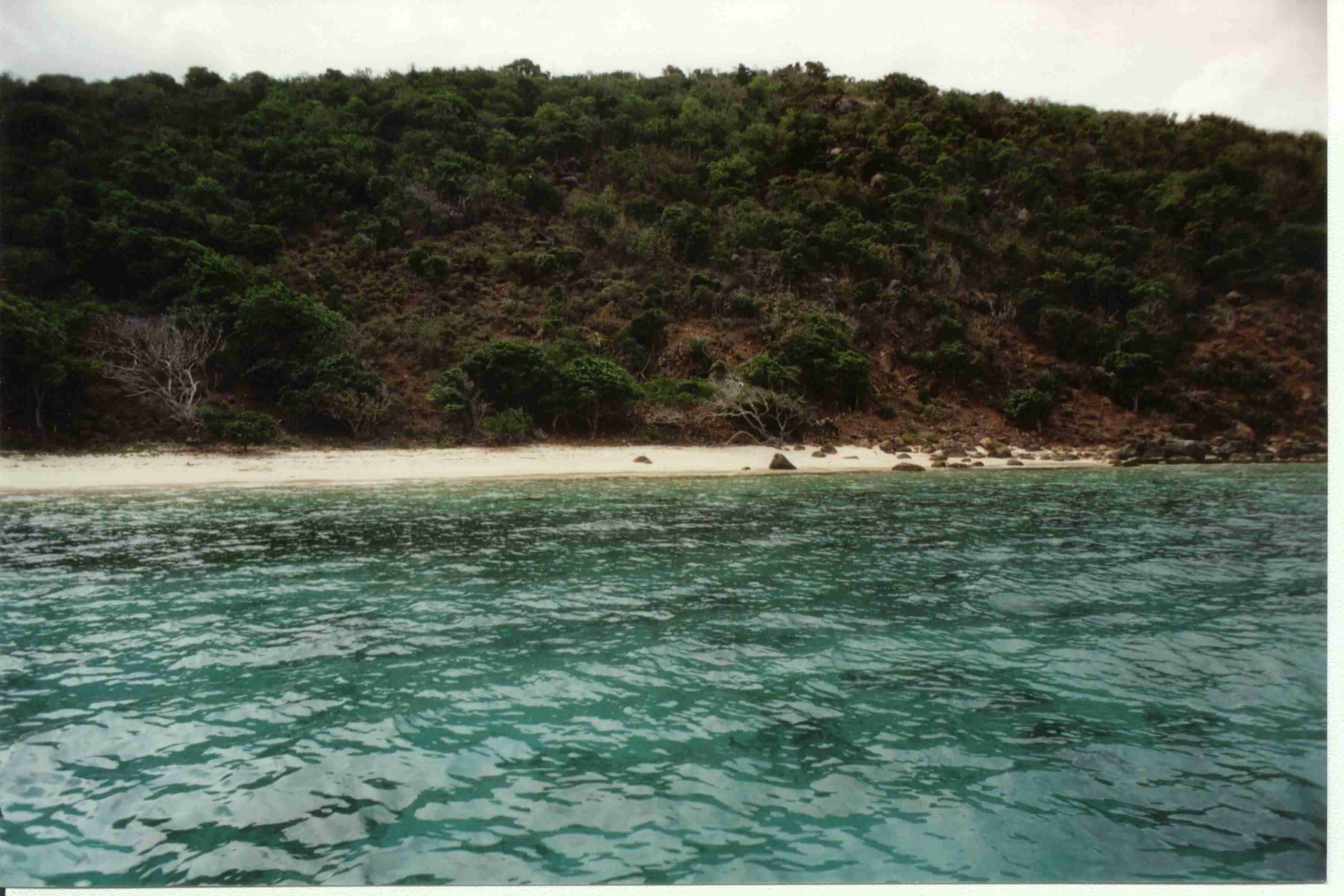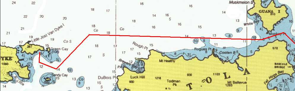 The fourth days sail was a great opportunity to learn a little about sailing in the rain. Really just a very quite sprinkle. We left GORDA SOUND with low clounds on the eastern horizon. We sailed north of the "Dogs" ... SEAL DOG, GEORGE DOG, GREAT DOG, WEST DOG, and then the COCKROACH ISLANDS. At this point we made note of our heading and planned our route in case of loosing visibility. After about a 30 minute rain shower, with no heavy wind to speak of, we came into the narrows between SCRUB and GREAT CAMANOE ISLANDS. We stopped on MARINA CAY to take on water and pick up some food items. From there we sailed between BEEF ISLAND and LITTLE CAMANOE, between TORTOLA and GUANA ISLAND, and made a mostly straight shot to LITTLE JOST VAN DYKE where we spent the night anchored by the deserted beach of MANCHINEEL BAY. Little Jost Van Dyke is the birthplace of the founder of the London Medical Society and the Royal Humane Society. He was a humerous man and wrote the following: