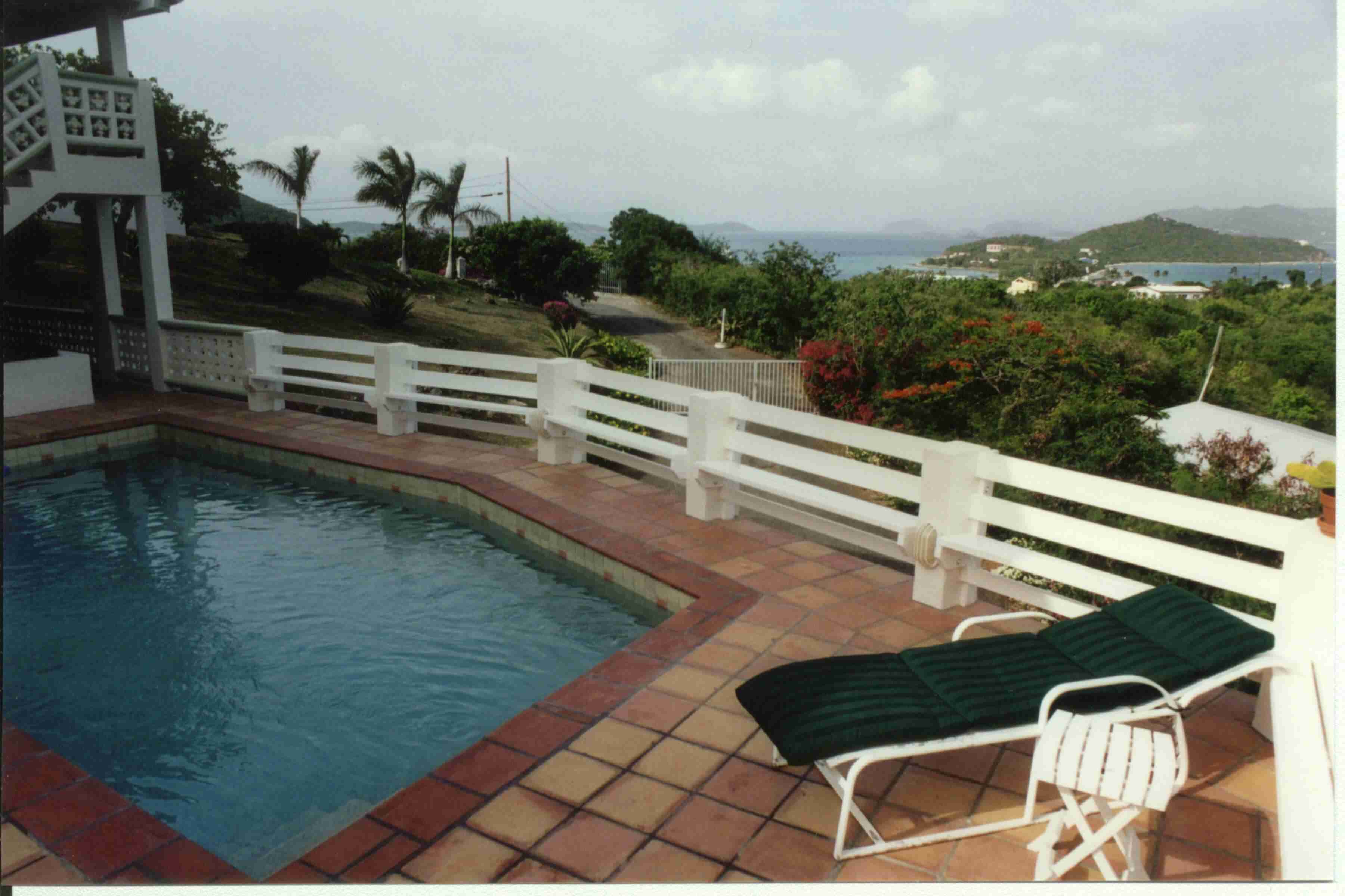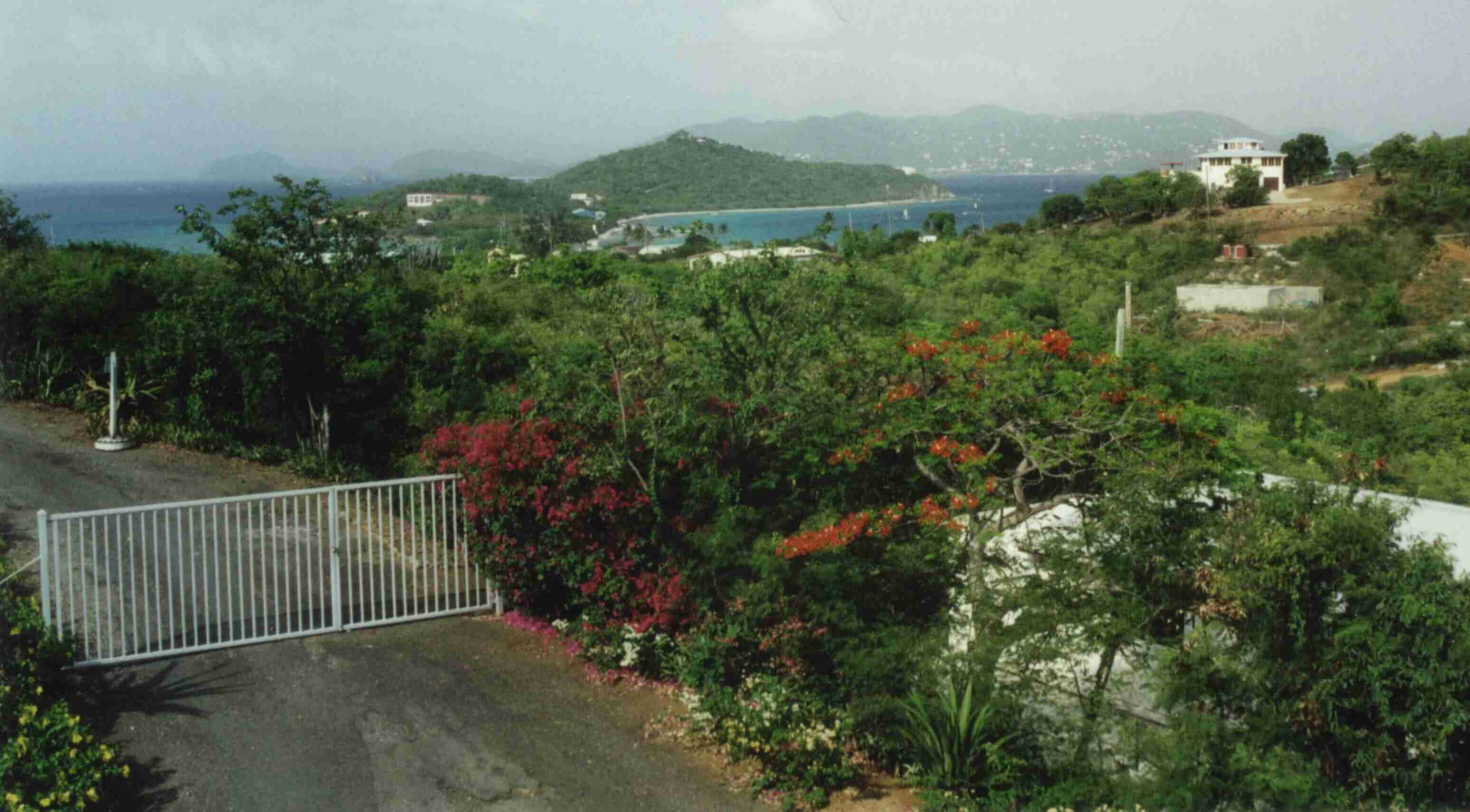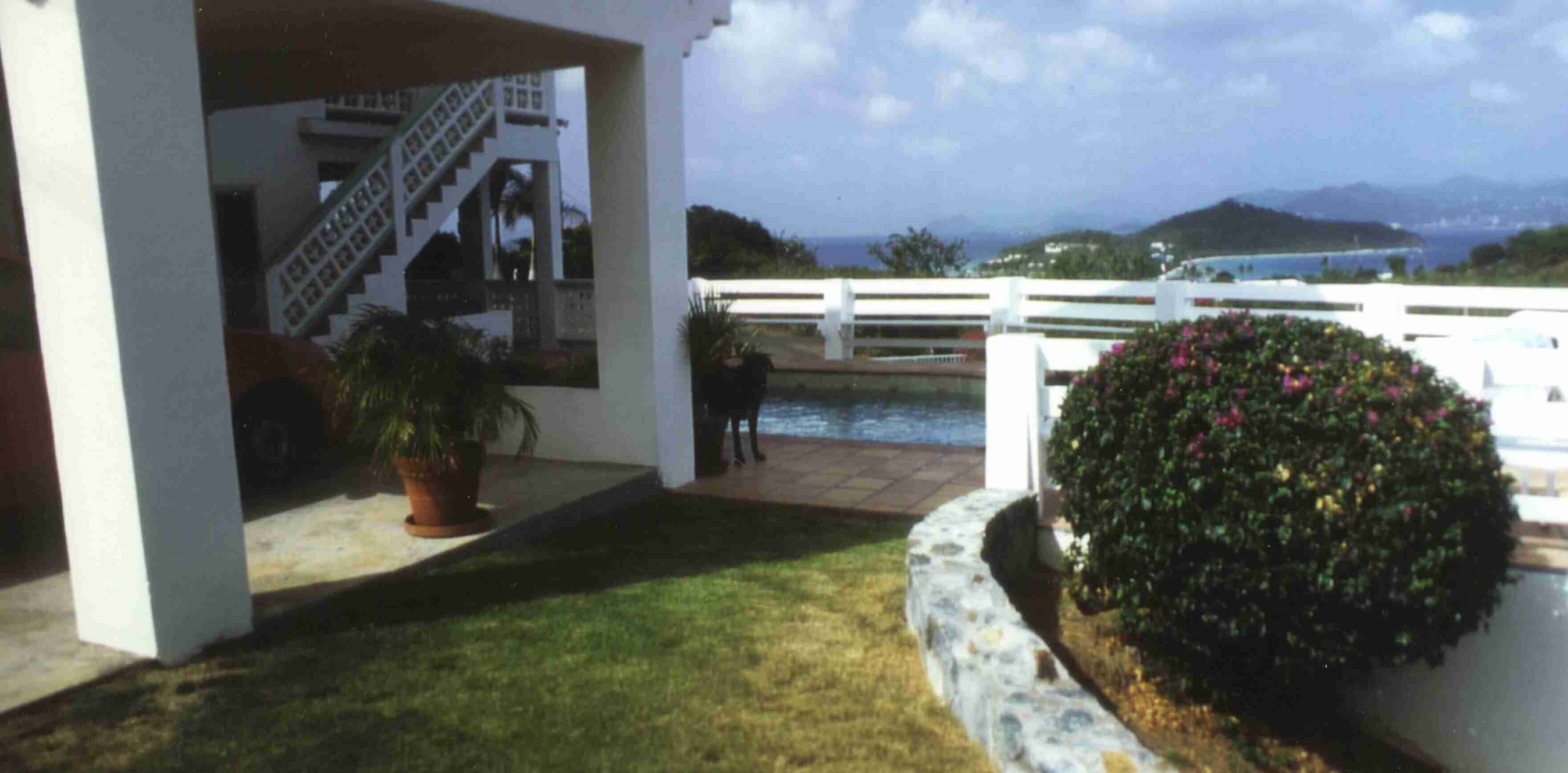 Max standing in the shadows ... welcoming us to a cool swim on the Terrace with Cabrita Point and St. John in the background.